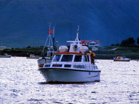The first one slows down as it glides past the beacon and into the Myre harbour. Now it's time for a good Sunday dinner - and dry clothes. |