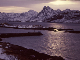 v-pil.gif - 958 Bytes High noon a week before the sun reappear. Hjellsand is snow-covered, except for the dark strip near the sea, where the high tide has washed away the snow. In the south the sky is noticeably lighter, showing that the sun is not far below the horizon.