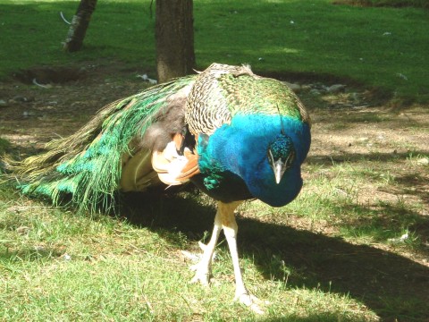 En påfugl viser kry de fargerike fjærene sine. [A peacock proudly shows its colorful feathers.] |